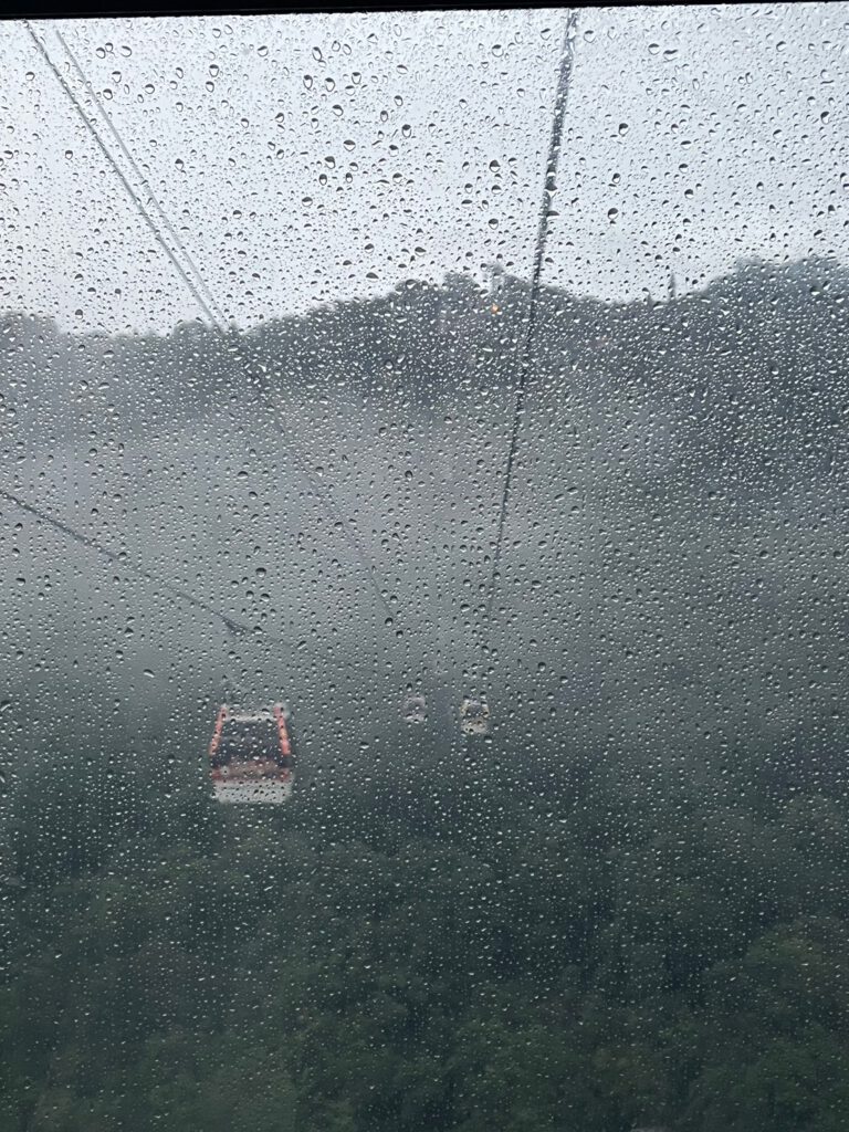 ฝนตกทั้งวัน นั่งกระเช้าไฟฟ้าขึ้นดอย อยู่ท่ามกลางเมฆหมอก บางช่วงที่กระเช้าลอยห่างจากสันเขาไม่มาก ก็จะเห็นไร่ชาเถี่ยกวนอินไร่เล็กๆสลับกันอยู่เป็นที่ๆ