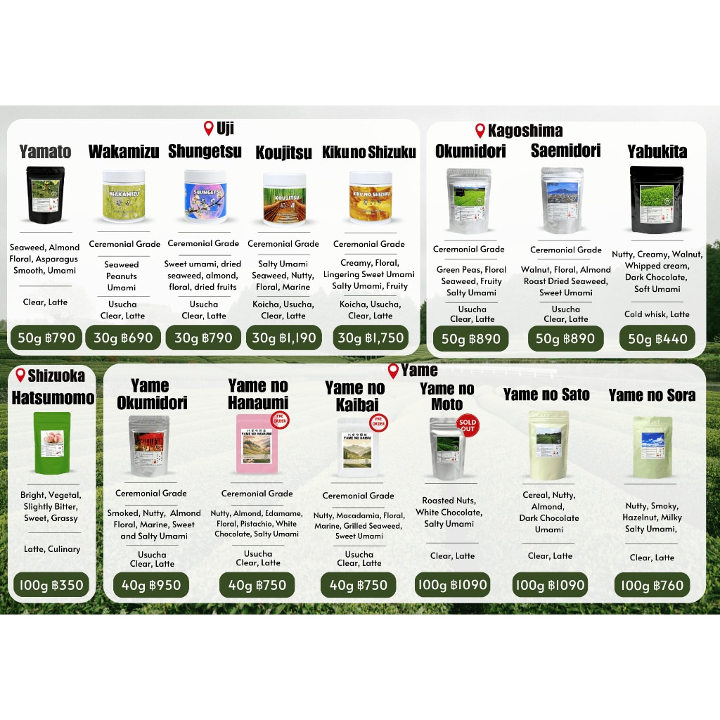 Tips: เป็นชาเกรด Usucha ระดับกลาง ชายังมีความขมฝาด เป็นสายพันธุ์ Okumidori ที่ไม่เขียวจนเกินไป มีรสชาติของอุมามิที่ชัดเจน นอกจาก Usucha แล้วยังสามารถนำไปชง Clear Matcha หรือ Premium Matcha Latte ได้เช่นกัน